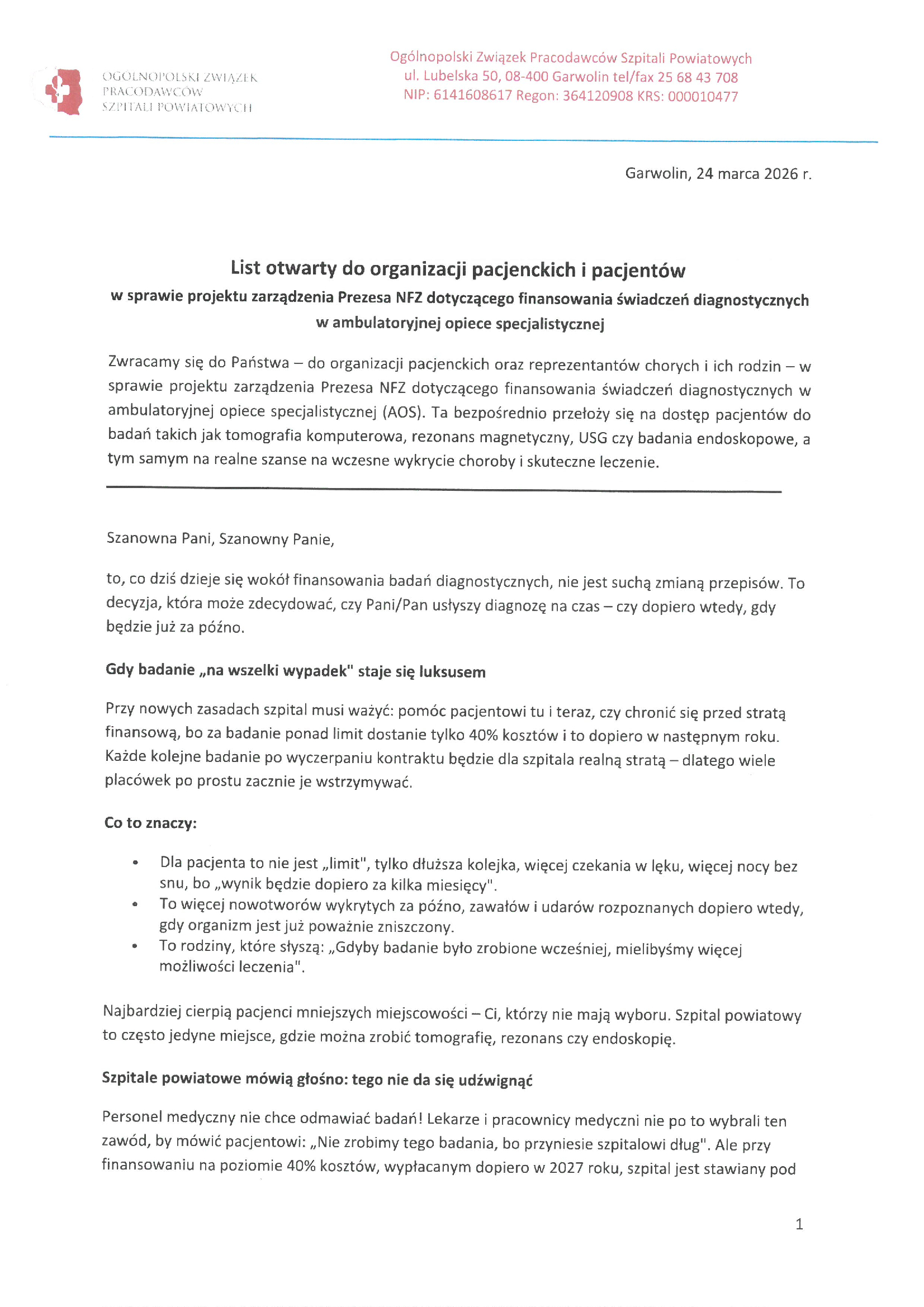 List otwarty do organizacji pacjenckich i pacjentów w sprawie projektu zarządzenia Prezesa NFZ